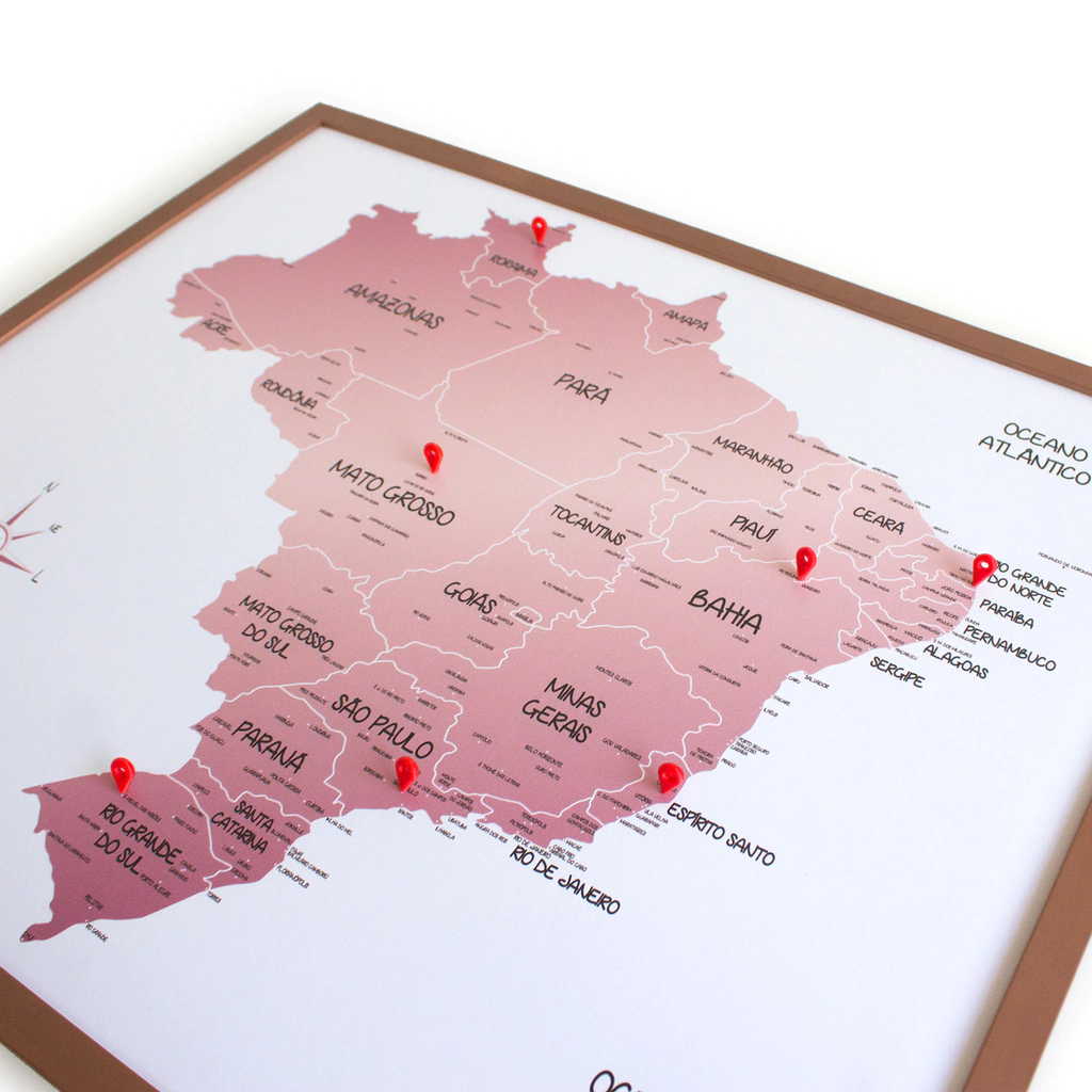 Nosso Mapa do Brasil é exclusivo! Desenvolvemos o design do produto com muita atenção e carinho, escolhendo cada uma das mais de 180 cidades a dedo.
