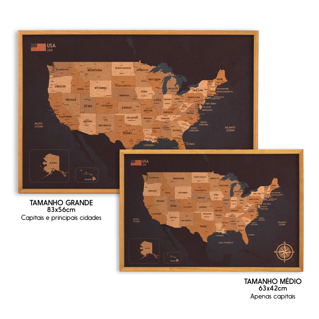 Conteúdo: 1 quadro mapa EUA Cortiça Luxo com moldura de madeira natural