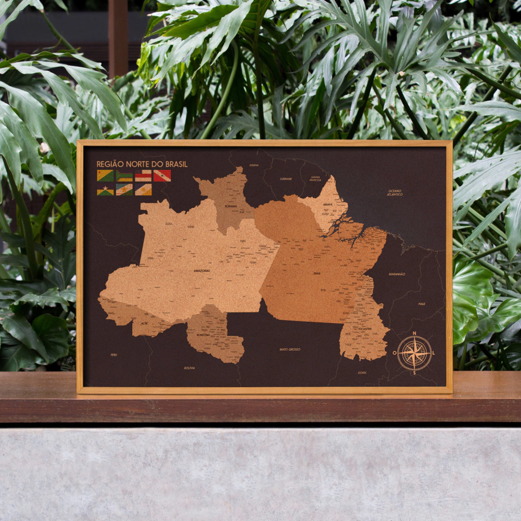 Conteúdo: 1 quadro mapa Região Norte Cortiça Luxo com moldura de madeira natural + 50 alfinetes de bolinha de brinde