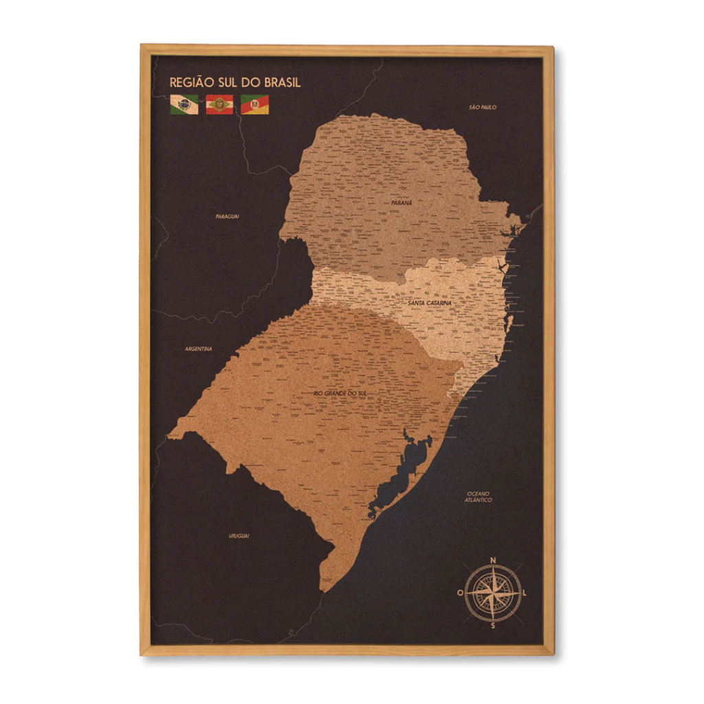 Conteúdo: 1 quadro mapa Região Sul Cortiça Luxo com moldura de madeira natural